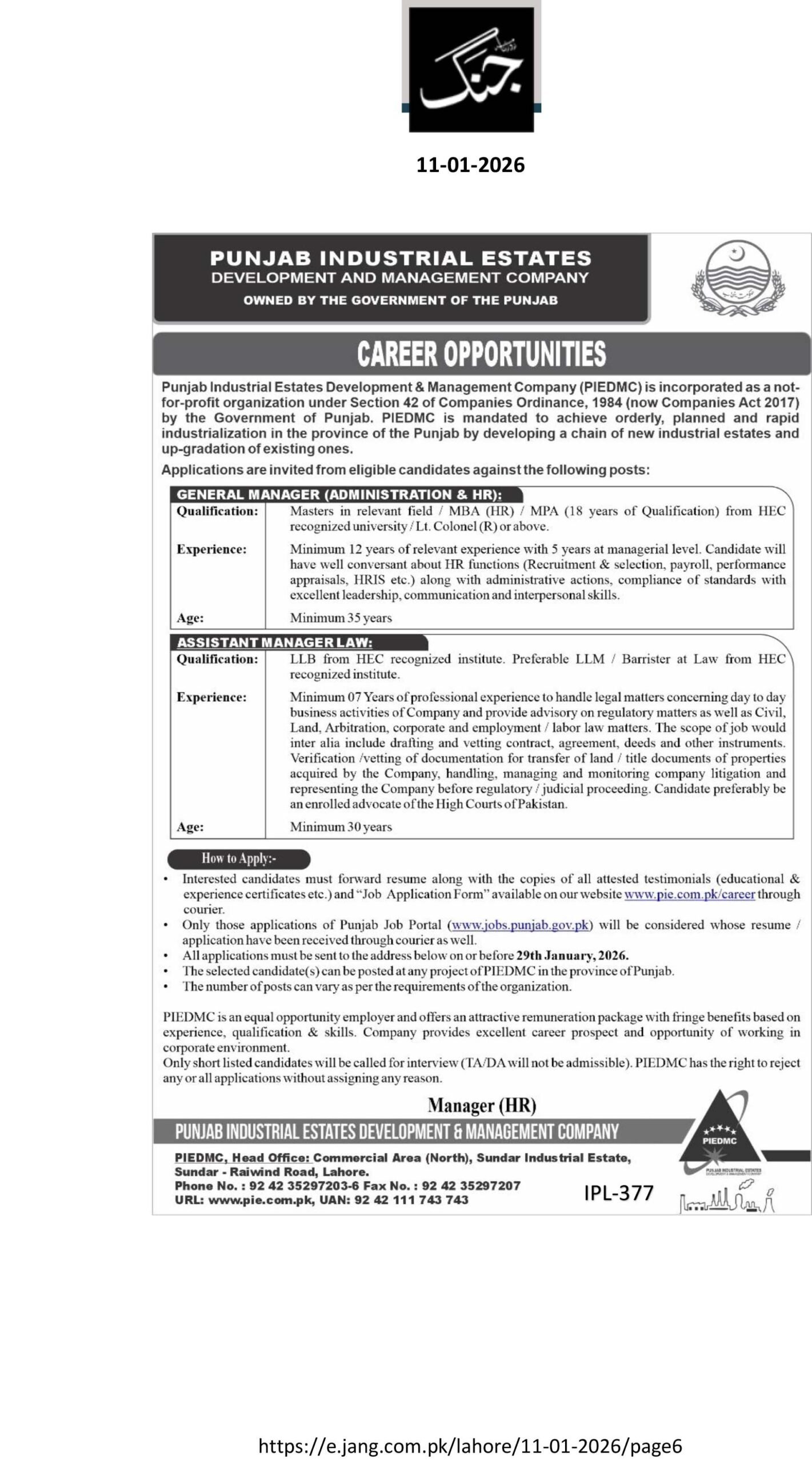 PIEDMC Career Opportunities 2026. Punjab Industrial Estates Development and Management Company (PIEDMC) is a premier government-owned organization dedicated to the rapid industrialization of Punjab by developing modern industrial estates. Currently, PIEDMC is inviting applications from highly qualified and experienced professionals for key positions, including General Manager (Admin & HR), Security manager and Assistant Manager of Law. These contractual roles offer an attractive remuneration package, fringe benefits, and a professional working environment for those looking to contribute to the province’s economic growth. Interested candidates must submit their applications via the Punjab Job Portal and through courier to be considered for these prestigious Government Jobs.