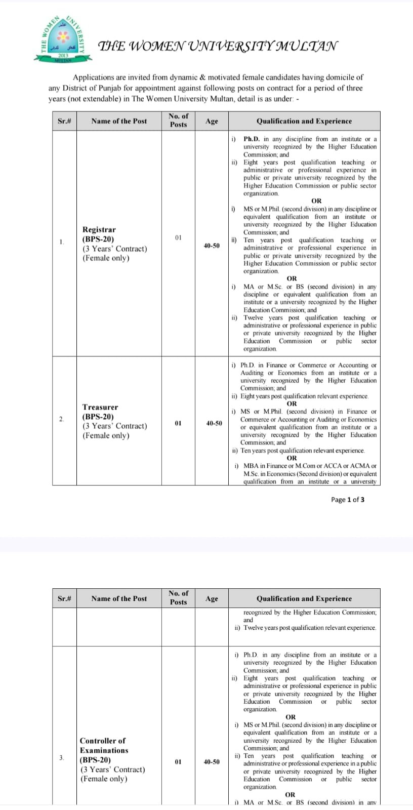 The Women’s University Multan is looking for qualified experts to manage its core administrative and financial operations. All advertised positions are for female candidates only.